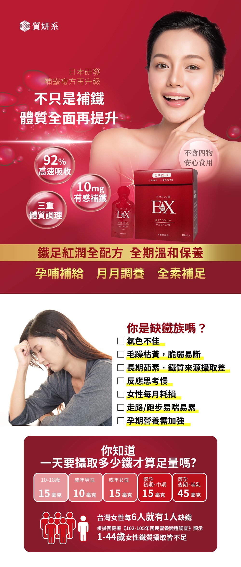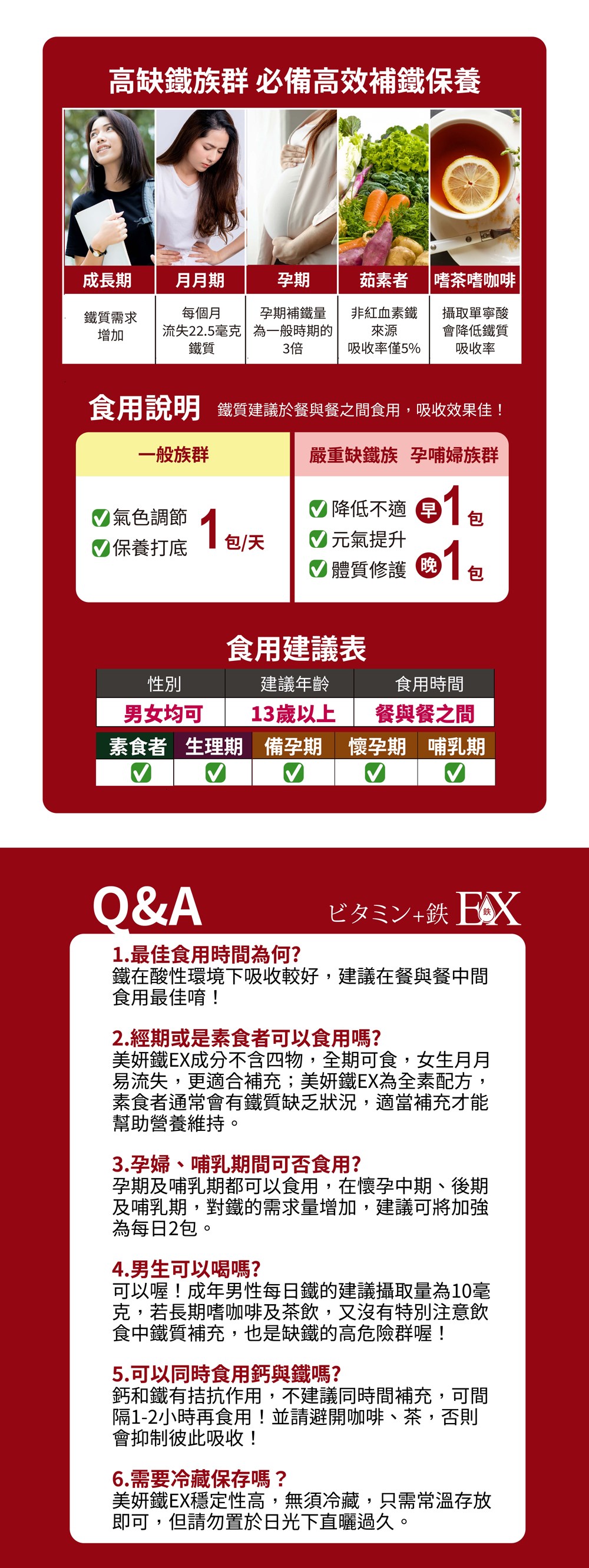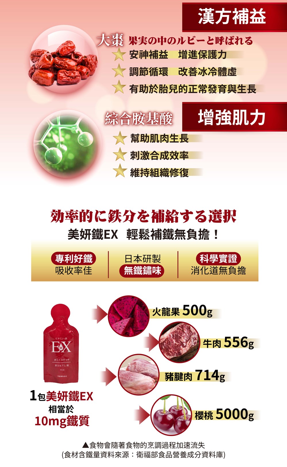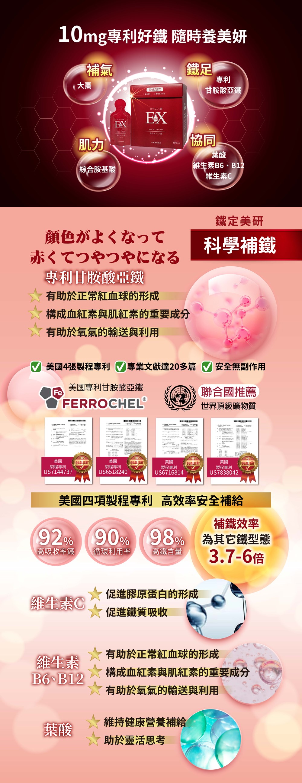選用美國四項製程專利的甘胺酸亞鐵(吸收率達92%),結合葉酸、維生素B6、維生素B12、維生素C,更助於紅血球的製造,再配上漢方大棗,高效補鐵、滋補養妍!